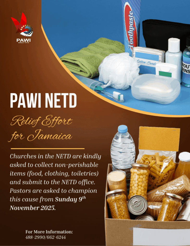 Upon collection of items, churches must coordinate with their Missions Director to have the items delivered to the North-East District office. All monetary contributions must be deposited directly into the PAWI T&T account: RBL Chequing Account INO PAWI Trinidad and Tobago No. 350804170101.